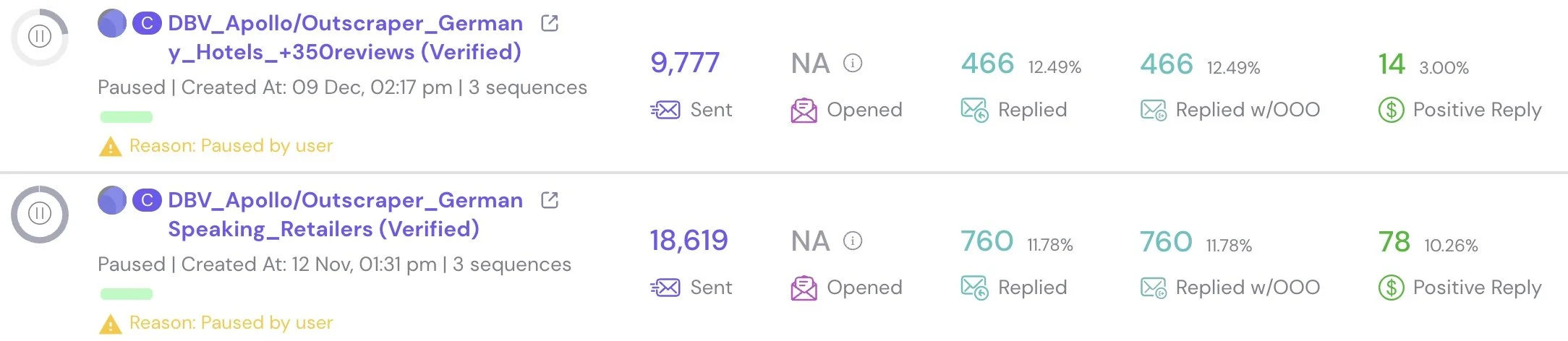 Outbound campaign dashboard showing 94 qualified buyer conversations generated in under two months from B2B manufacturing outreach to retailers and hospitality buyers.